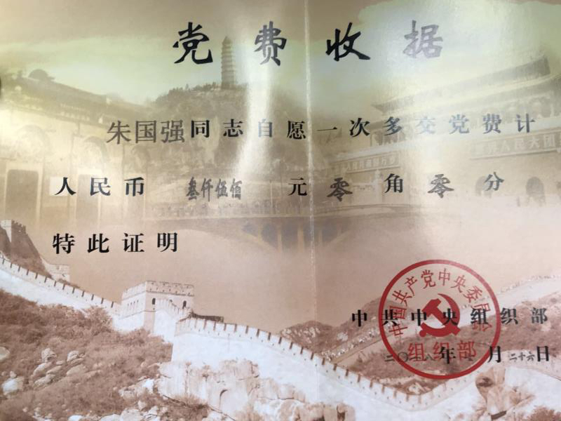 公司鉚焊車間員工、共產(chǎn)黨員朱國強(qiáng)同志,主動(dòng)將自己獲得"銅陵好人"榮譽(yù)的獎(jiǎng)勵(lì)金3500元,作為特殊黨費(fèi)上交,受到中央組織部的充分肯定和贊揚(yáng),并頒發(fā)特殊《黨費(fèi)收據(jù)》證書。